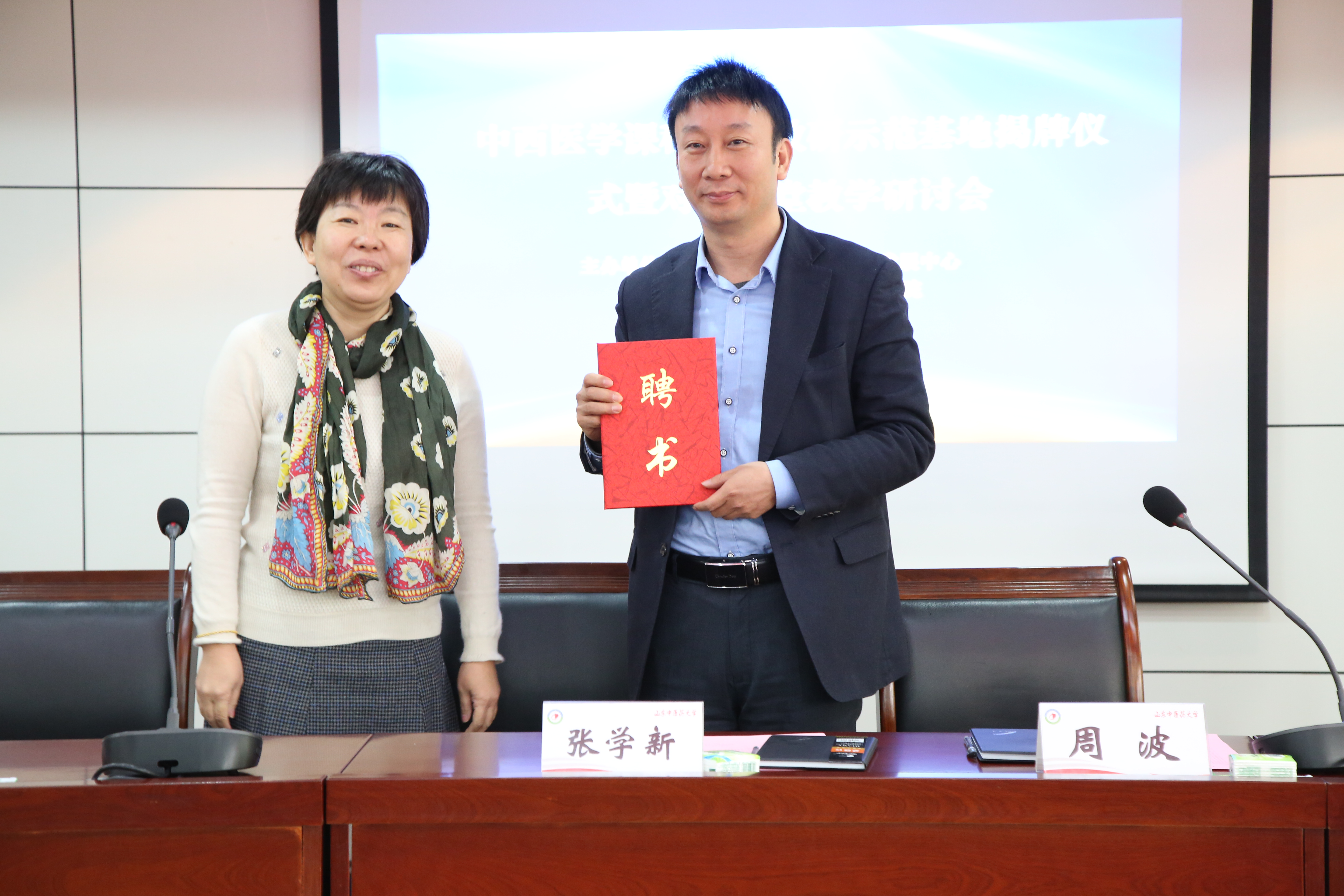 院长王世军出席揭牌仪式,共同“中西医学课程对分教研全国示范基地”揭牌。基地下设两个工作室“中医学课程对分教研工作室”、“基础医学课程对分教研工作室”,分别由徐琬梨老师和王媛老师担任负责人,聘请张教授为基地和工作室的指导专家。王琳处长、王世军院长为张学新教授颁发了基地和工作室的特聘指导专家聘书。
