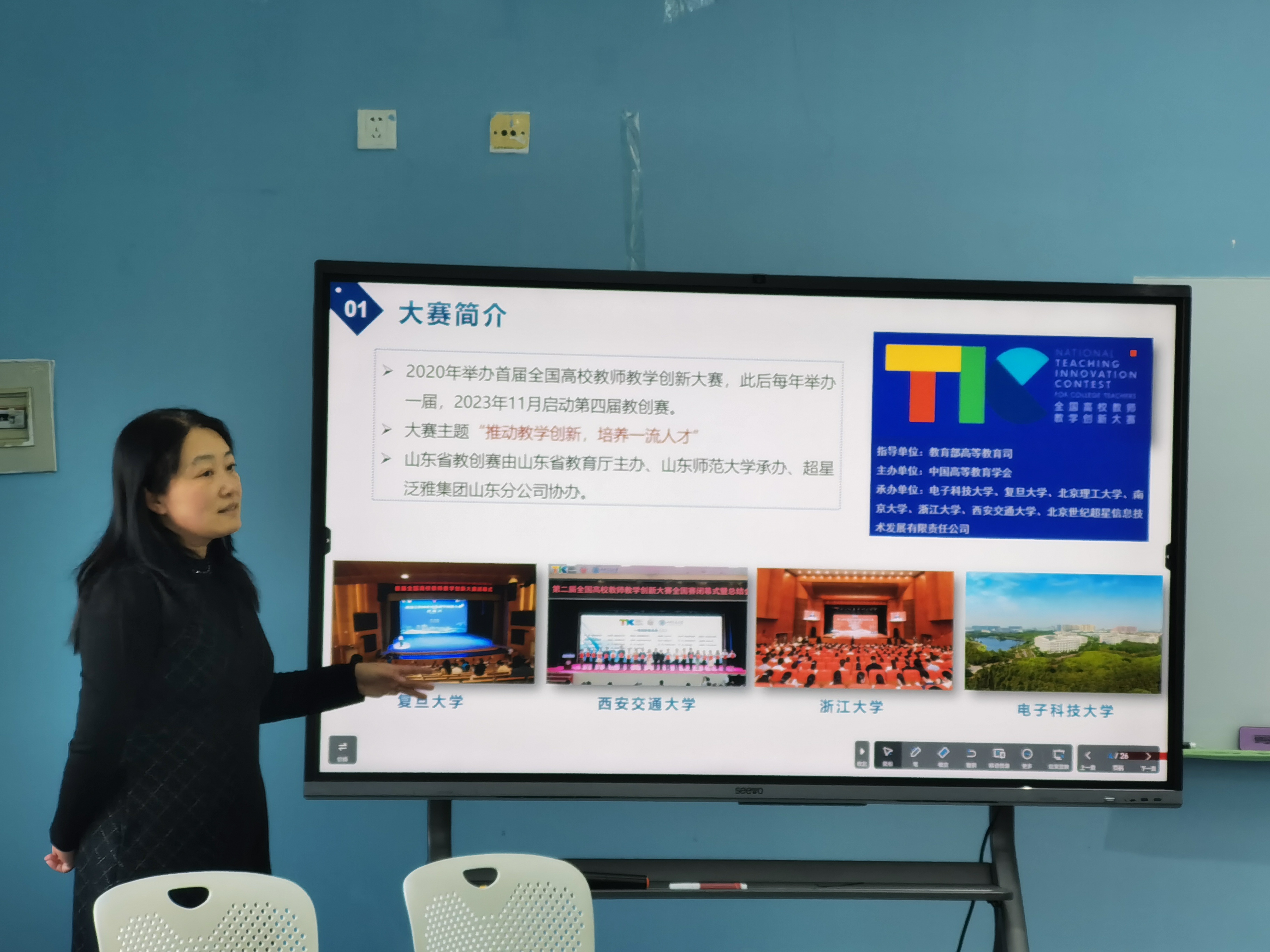 接下来,团队于鹰、冯伟科、王彦芳、孔畅、乔远静五位老师分别进行了主题发言。于鹰老师结合自己三次参加教创赛的体会,分别从大赛概况、网络评审、现场评审等几个方面详细介绍了教创赛的参赛要求和评价标准,认真解读了大赛的指标内涵,同时总结出了“创新是王道,学习是正道,合作是要道”的参赛心得,在场团队老师们深受启发。于鹰老师作为主讲教师获得2023年山东省高校教师教学创新大赛课程思政副高组二等奖,作为团队主要成员获得首届山东省高校教师教学创新大赛正高组一等奖,在教创赛中积累了丰富的经验。