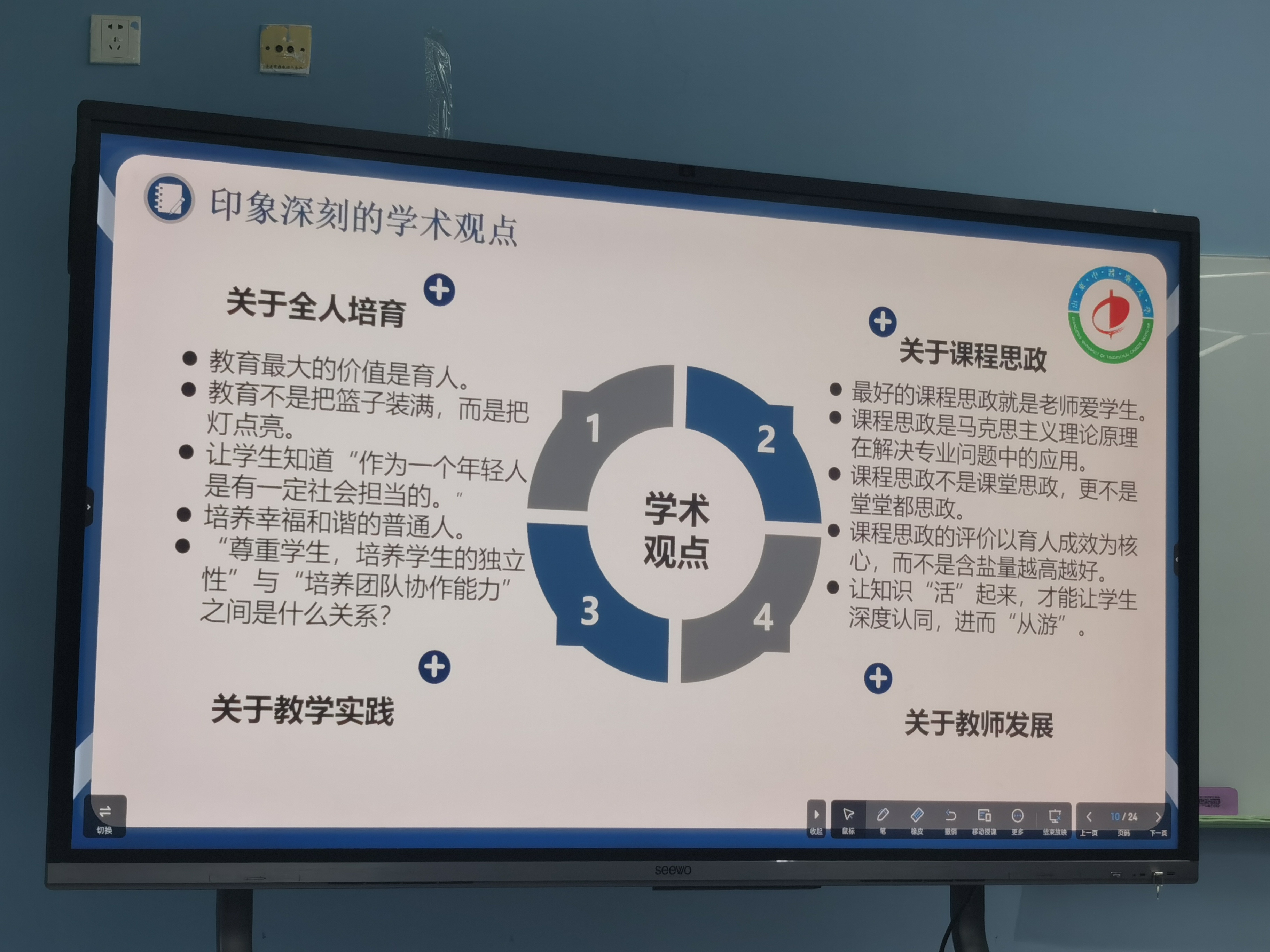 最后,乔远静老师分享了她11月底赴清华大学参加2023年山东省高校青年教师教学能力研修班的学习体会,围绕“贯穿始终的教学活动”“印象深刻的学术观点”“高效能教师特质”,进行了“反思教与学,提升教学影响力”的主题交流,乔老师诙谐幽默的语言、精辟独到的见解以及亮点频出的金句,引来现场老师们的阵阵欢笑,“教育不是把篮子装满,而是把灯点亮”“培养幸福和谐的普通人”“最好的课程思政就是老师爱学生”“教师的价值是解决重点与难点”“教学需要团队”……这些语言直中心扉,引人深思。