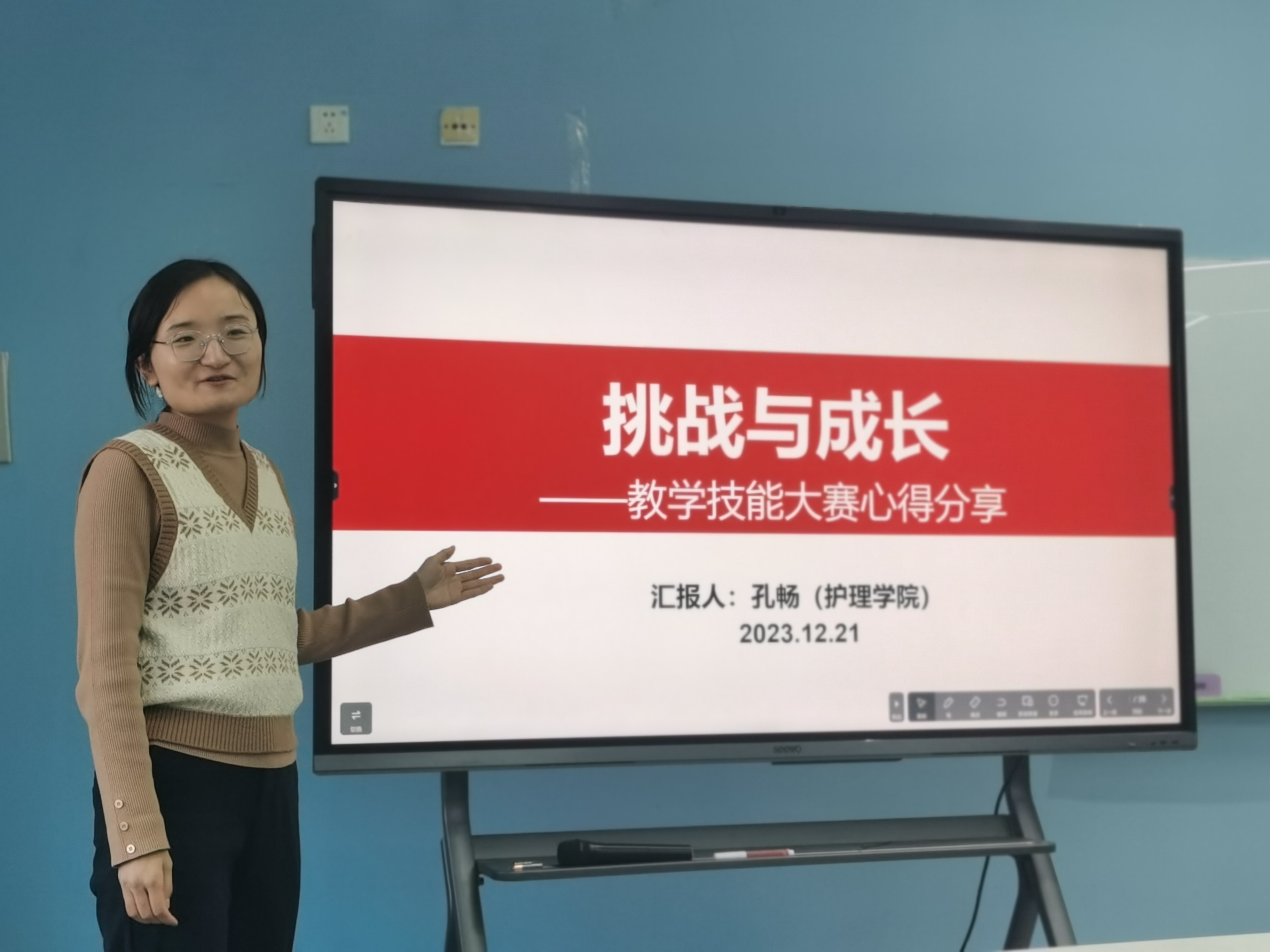 孔畅老师针对教学技能大赛和青教赛,围绕“挑战与成长”分享了自己的心路历程,总结出了“教学选题三注重、教学策略三原则、教学过程三要领、教学语言三要求、总体效果三特性、赛前演练三准备”的参赛经验,反映出团队青年教师在教学改革和教学创新中勇于实践、大胆探索的热忱和坚韧,为团队发展注入了新鲜活力!孔畅老师获得2023年学校教学技能大赛综合类中级及以下组三等奖、2023年学校青教赛一等奖。