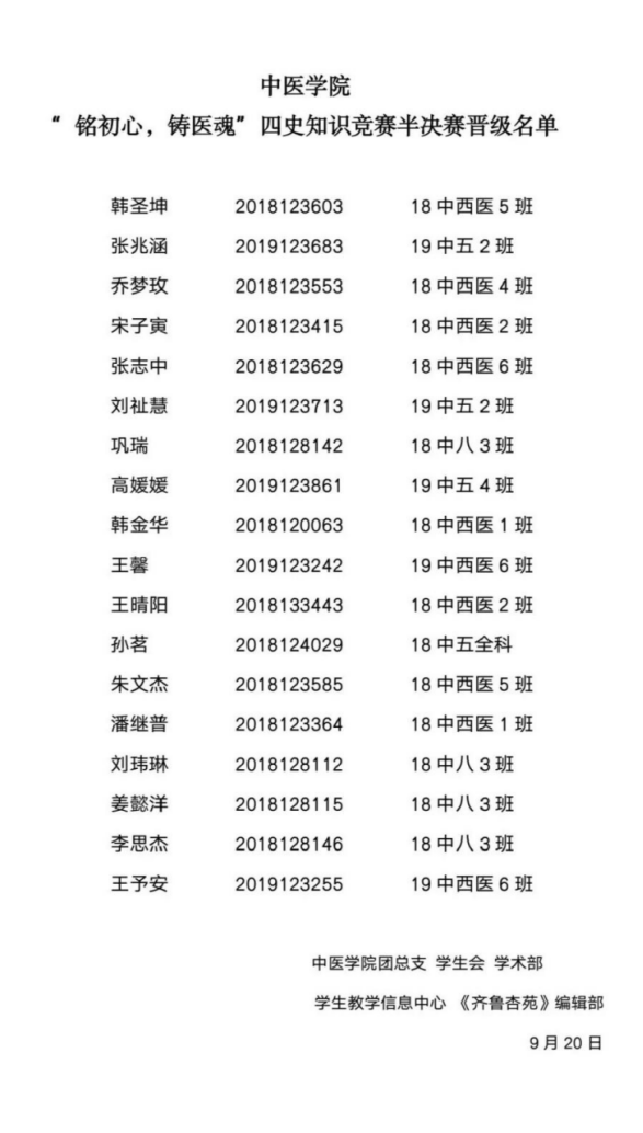 “铭初心,铸医魂”四史知识竞赛半决赛已于9月20日落下帷幕。经过激烈的角逐,恭喜以下同学进入“铭初心,铸医魂”四史知识竞赛决赛。