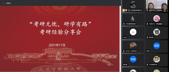 团总支共同举办了线上“考研无忧,研学有路”系列讲座之优秀学生党员考研经验分享会,2016级中医学五年制的姜春宁、于苗、李坤宁、尹淑媛、李昀星、刘熠斐等6位同学受邀做分享报告。2018级中医学(五)、中医学(五)(惠民)、中西医临床医学本科专业以及2021级专升本全体同学参加此次分享会。
