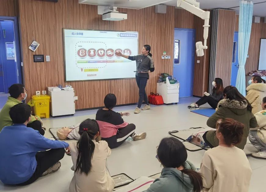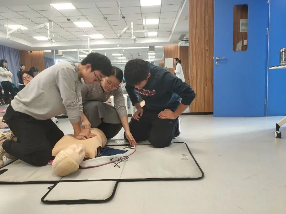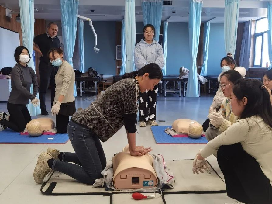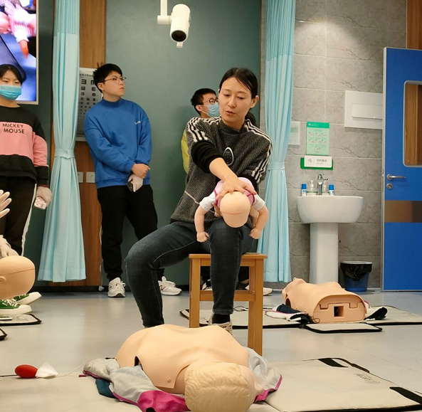 带教老师首先对心肺复苏术(CPR)的基本原理及操作步骤进行了讲解示范。心肺复苏术是针对呼吸心跳停止的急症危重病人所采取的关键抢救措施,目的在于恢复患者自主呼吸和自主循环。同学们积极踊跃参与练习。第二部分是海姆立克急救法的培训。海姆立克急救法主要针对异物堵塞呼吸道致患者无法呼吸的突发意外情况,通过不断冲击上腹部的操作使膈肌瞬间抬高,迫使肺内气流将气道内的异物冲击出来,又被称为“生命的拥抱”。老师详细讲解了适用于成人及一岁以上儿童的站位、卧位及自救的手法。此次活动中师生互动频繁,学生讨论热烈,课堂气氛活跃,实践操作性强。通过本次支部共建活动,学生掌握了以上两种急救方法,通过正确的救助方法及时有效提高救治率;同时进一步培养了学生们尊重生命、敬畏生命的大医情怀及积极救助、为民服务的精诚意识。本次活动取得圆满成功。