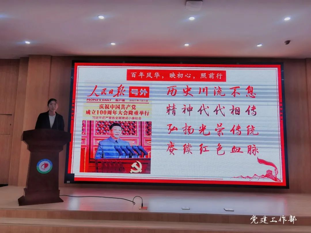 而后刘娜彤同学以“庆建党伟业,传百年薪火”为主题宣讲了中国共产党一百年来的光辉奋斗历程,并提倡在座同学要继续弘扬光荣传统,赓续红色血脉。在中国共产党成立之前,由于没有正确的领导,中国人民付出了沉重的代价和巨大的牺牲,是中国共产党正确的领导给处于水深火热中的中国人民带来了光明和希望。为了实现中华民族伟大复兴,中国共产党团结带领人民浴血奋战,并最终取得了新民主主义革命的胜利。中国共产党一直立足于本国国情,以经济建设为中心,坚持四项基本原则,坚持改革开放,坚定不移地高举中国特色社会主义的伟大旗帜,在不久的将来,中国的复兴梦强国梦一定会如期实现!刘娜彤讲到在座青年学生应该以史为鉴,牢记历史;要为人生立宏愿,不负青春,奋斗不止;要坚定理想信念,开创美好未来,并跑好实现中华民族伟大复兴“中国梦”的接力赛。