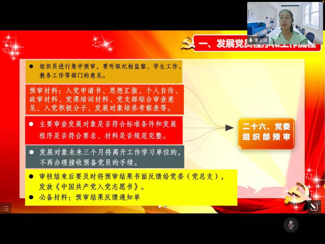 党总支组织员李玉婷老师从“发展党员程序和工作流程”和“发展党员工作的注意事项”两大方面为入党积极分子讲解了发展党员程序,入党积极分子、发展对象的确定和考察,预备党员的接收等应注意的问题,并着重强调了发展党员过程中的新增要求。通过这堂党课,积极分子丰富了党建理论知识储备,了解了如何入党,如何早日成为一名优秀的党员等问题,最后李玉婷老师希望同学们能发扬担当和斗争精神,勇于承担责任,端正入党动机,以实现中华民族伟大复兴为己任,激扬青春,不负时代,不负韶华。