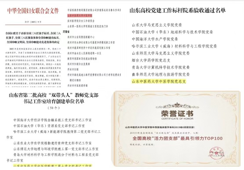 全年理论学习中心组学习12次;全年开展处级干部讲党课系列活动16次,支部书记讲党课50余次;党风廉政建设专题会议3次,意识形态专题会议3次;发展党员260名;“灯塔”e支部录入活动239次,参与率达97.6%;荣获2022年“全国巾帼文明岗”称号,获评山东高校党建工作标杆院系、教工第七党支部书记工作室获评山东省第二批高校“双带头人”教师党支部书记工作室;2019级中西医临床本科6班获全国高校活力团支部;学生党员获国家级奖项112项,省级奖项111项,校级奖项1310项。
