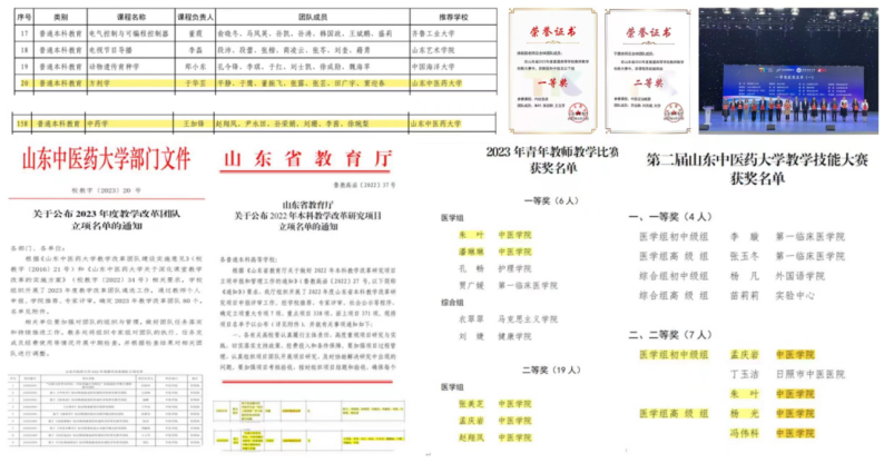 在2023年度优秀研究生导师评选中,1名导师获得“山东省优秀研究生导师”称号,5名导师校级“优秀研究生导师”,2名研究生管理人员获得“优秀研究生教育管理工作者”称号,1名教师获批全国中医药研究生核心课程规划教材(第一批)主编。获批山东省研究生精品课程1门,山东省研究生优质课程1门,山东省研究生优秀案例库2个。