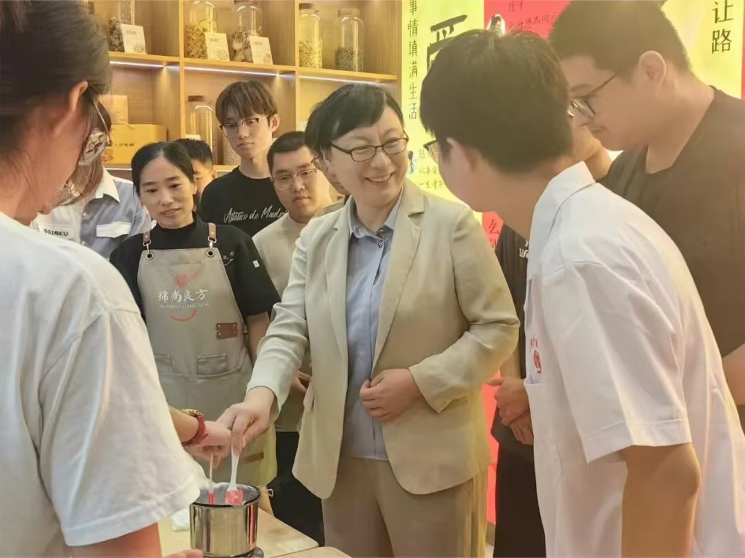 “杏源”中医药文化夏令营锦章堂站的学生,参与药皂、中医药奶茶体验活动,与学生亲切交谈,叮嘱学生扎实基础、强化实践,为基层医疗建设贡献青春力量。在潍坊市妇幼保健院,艾邸参观院区特色科室中医科和儿童保健科,并就妇女儿童全周期医疗康养、康复专业人才引育和课程建设提出合作需求和指导建议。在中医药文化夜市现场,艾邸体验健康茶饮、适宜技术诊疗等项目,感受中医药文化融入生产生活的现实魅力。