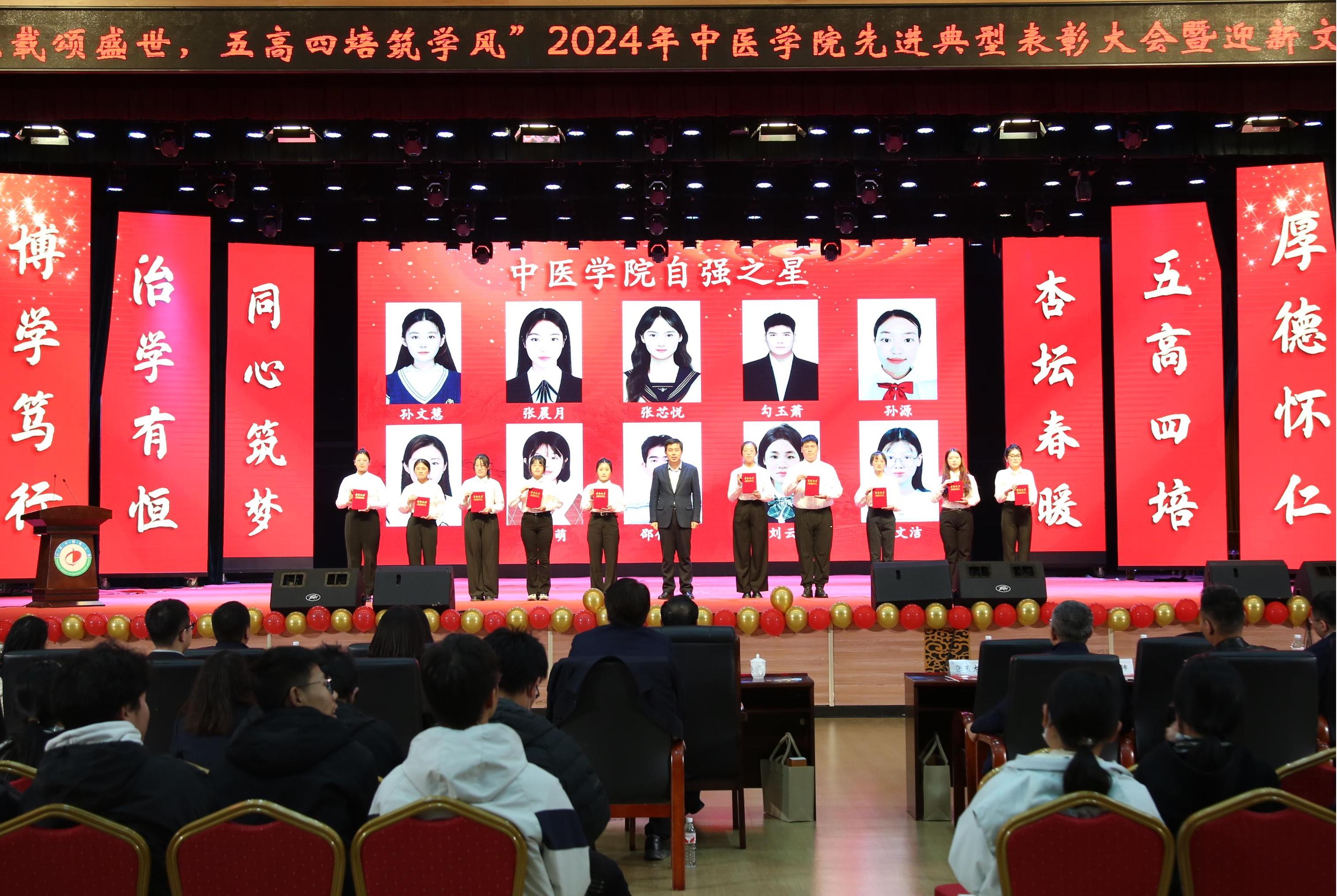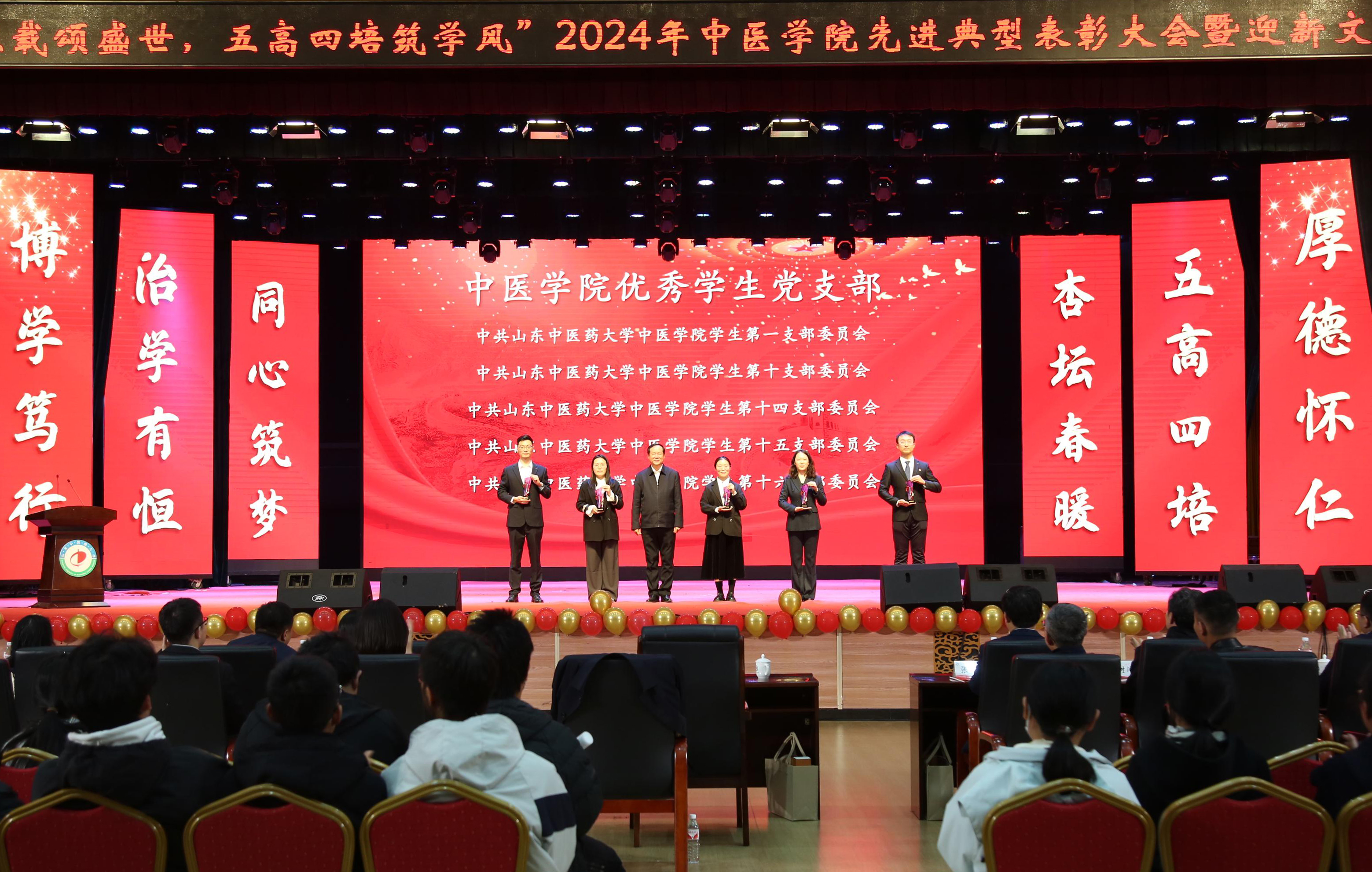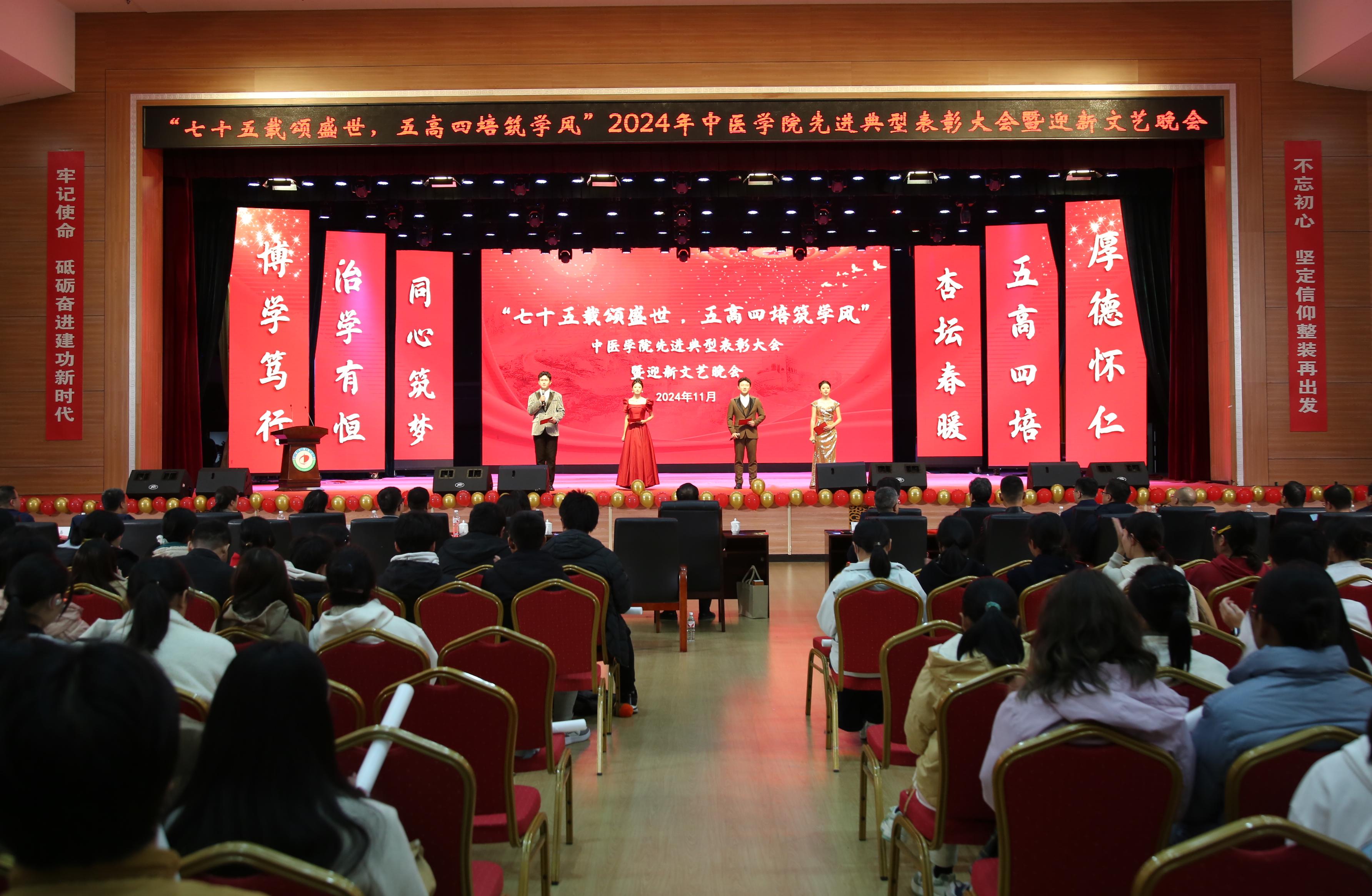 “七十五载颂盛世,五高四培筑学风”2024年先进典型表彰大会暨迎新文艺晚会在长清校区大学生活动中心举办。校党委书记张立祥,党委委员、纪委书记、监察专员王丽丽,党委委员、副校长张玉龙,党委委员、党委宣传部(教师工作部)部长陈众,山东新中鲁中医医院院长李树沛出席活动并颁奖。