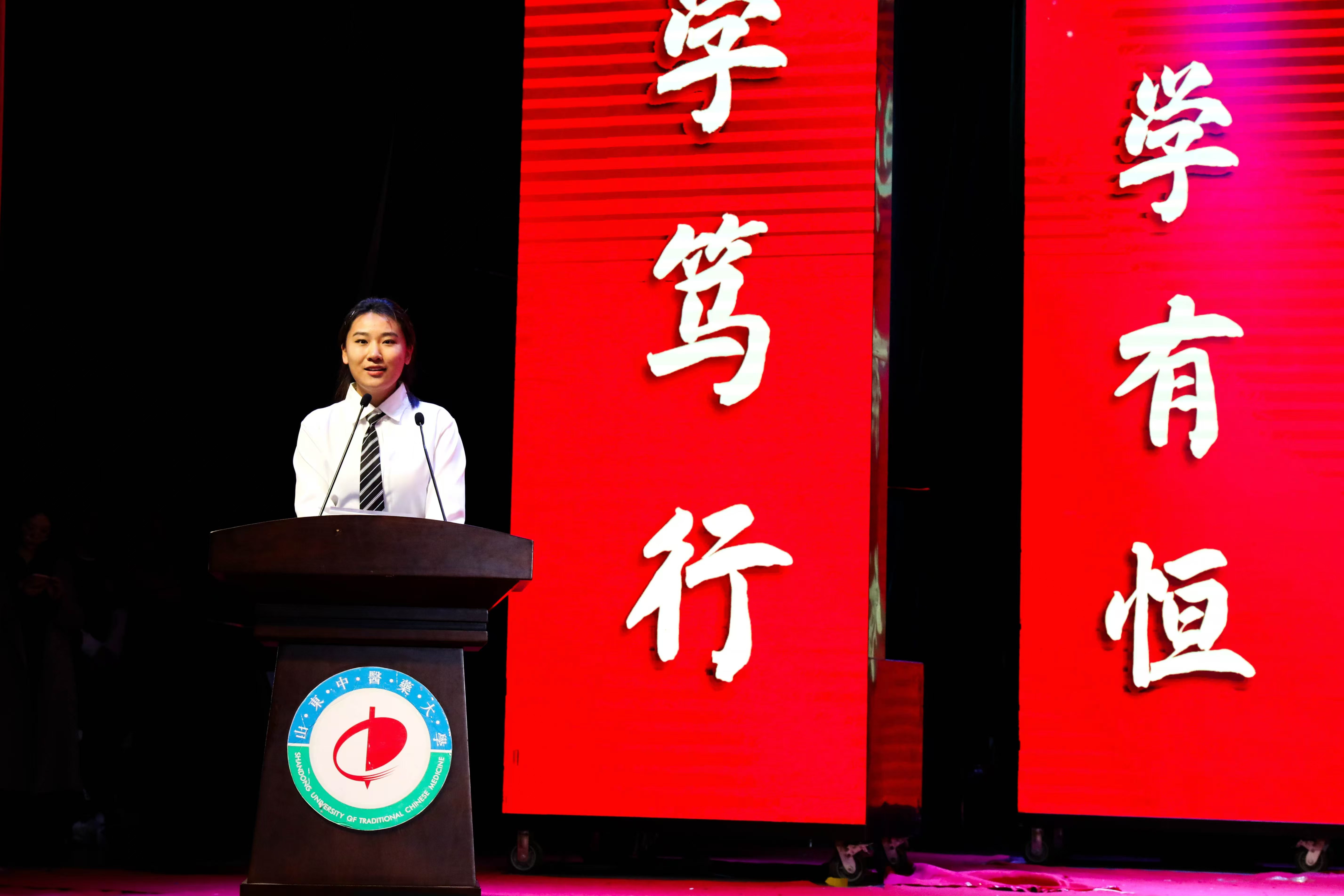 学生代表季一诺通过初识山中医、学在山中医、热爱山中医、携手山中医、启程山中医五个方面表达了对学校的深厚情感和学好中医知识的坚定信念。