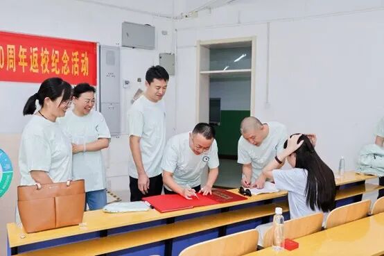 下午,校友们身着自行设计的纪念衫,按照彼此约定时间来到当年共同上课的教学楼201教室——这个承载了无数课堂记忆的空间,成为此次返校的“第一站”。在教室门口的签到册上,校友们逐一签下姓名,领取校徽、院徽。