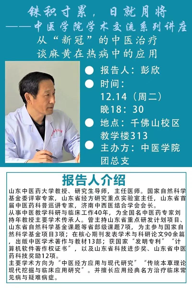 学术交流系列讲座在千佛山校区教学楼313顺利举办。我校退休教师、山东省经方研究重点实验室彭欣教授应邀作了题为“从中医“抗疫”论麻黄在热病中应用”的讲座。