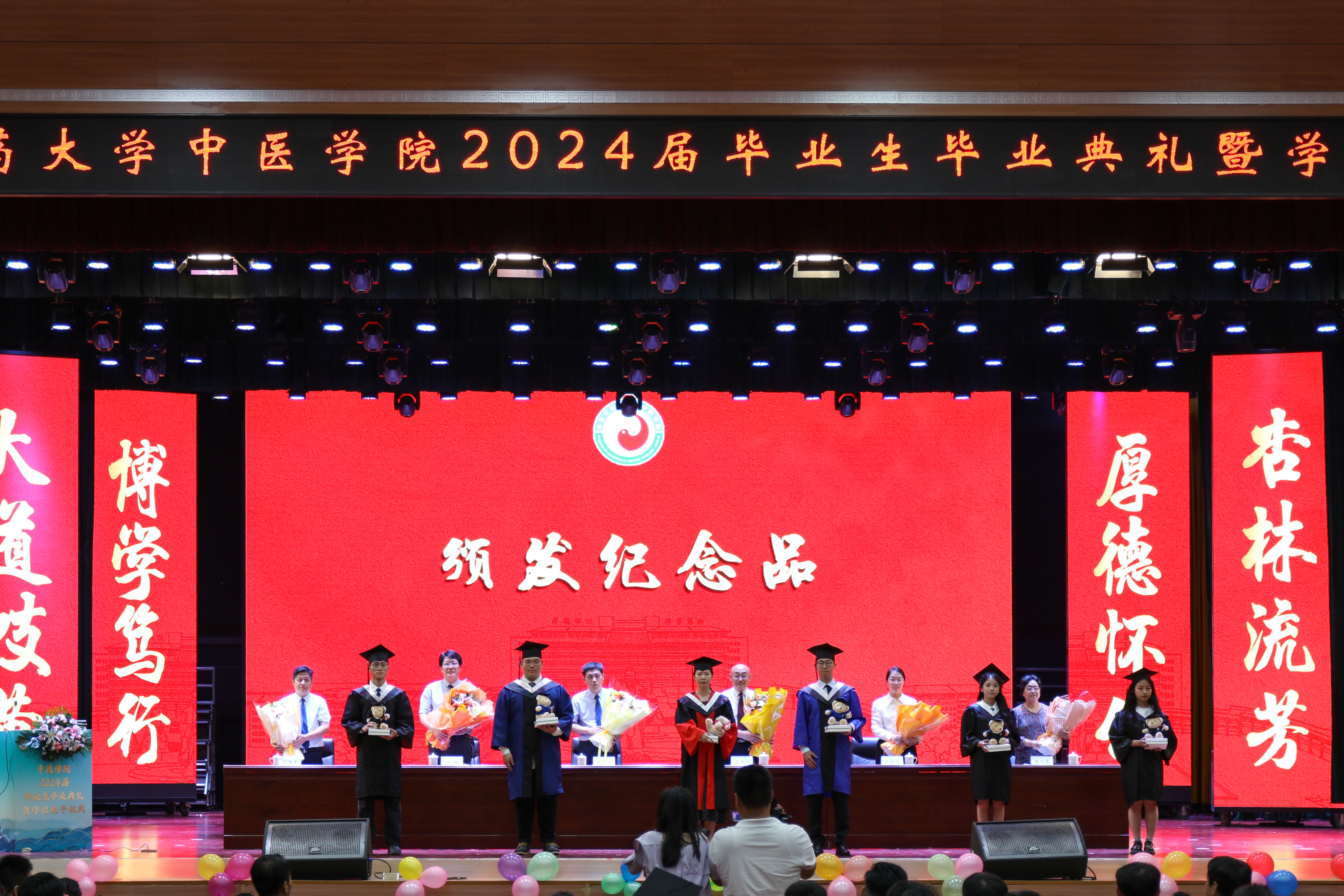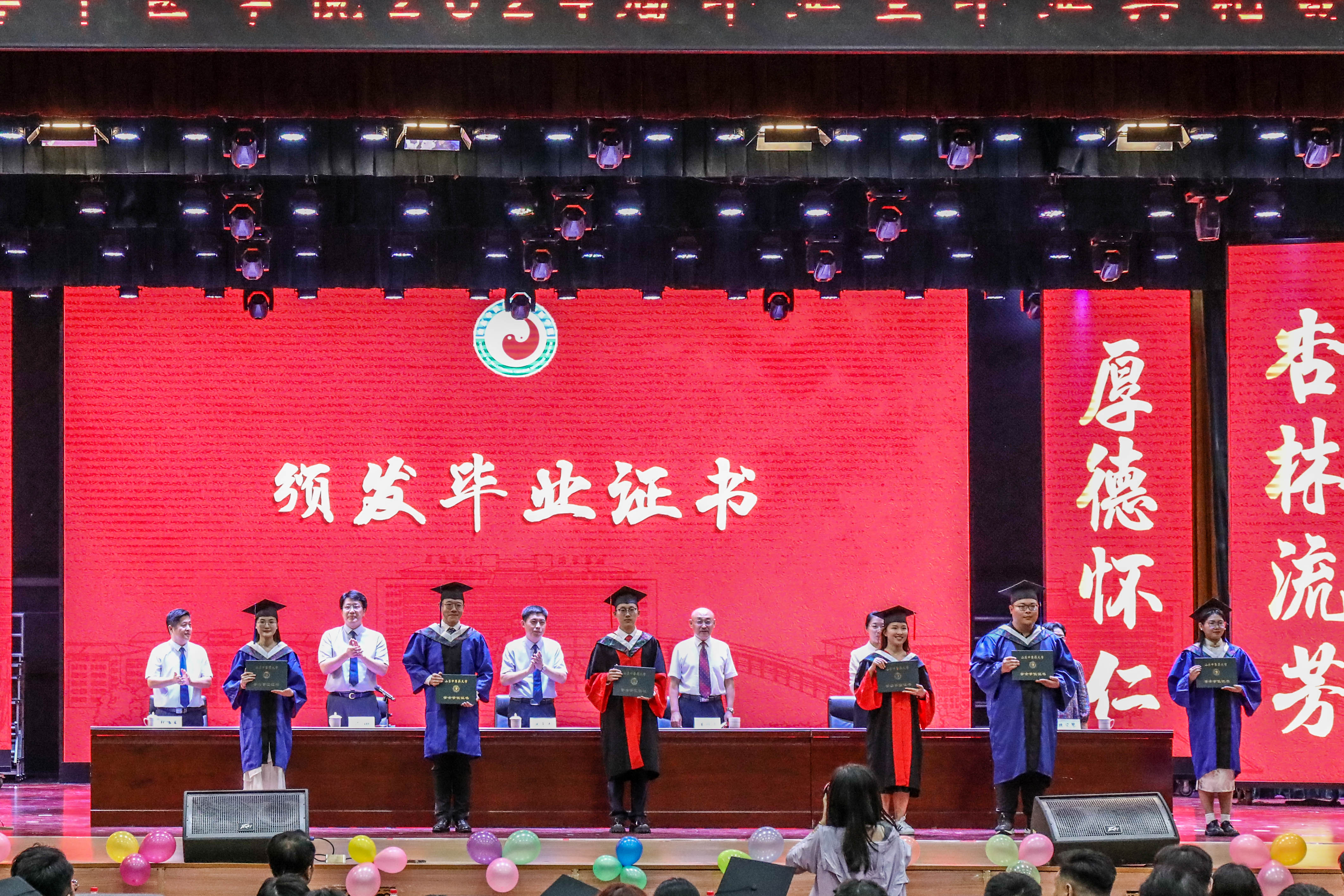 毕业典礼正式开始前的歌曲联唱《凤凰花开的路口》《纪念》《骄傲的少年》《同桌的你》《那些年》《你曾是少年》《起风了》《无名的人》《追风赶月的人》《入海》等暖场演出点燃全场,奏响了“杏林华章·大道岐黄”的序曲,唱响了毕业生对母校的浓浓眷恋、对师友的依依不舍、对未来的无限憧憬,唱出了学院对毕业生的深深祝福和浓浓情意。全体毕业生辅导员、教师代表深情合唱《祝你一路顺风》,为毕业生送上新征程最美好的祝愿和期待。