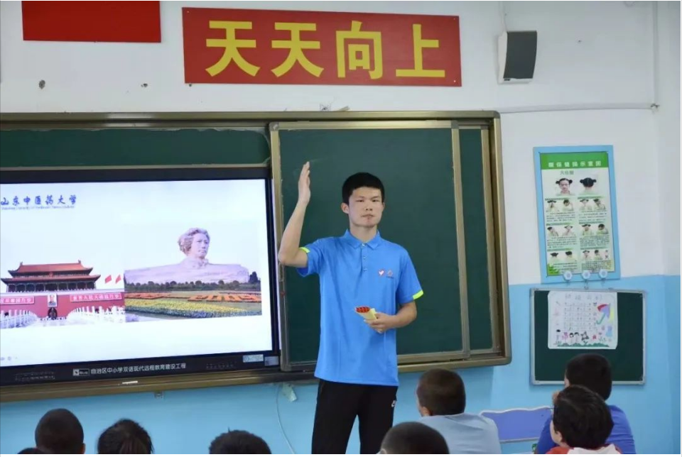 几天后,我带着《沁园春·长沙》的鉴赏与朗诵课程忐忑不安地回到了讲台上,但当我讲解到“恰同学少年,风华正茂;书生意气,挥斥方遒……”一句时,一位小同学自告奋勇地解析让我忽地一怔,“这句话是说:‘像老师们这样的大学生,潇洒又有才华,同时还是我们学习的榜样呢!’”小同学天真无邪的笑脸又将我迅速拉回到现实,我看着讲台下数十张如同天使般纯真的笑脸,忽然意识到,我们在这里,每一次的授课,每一次的交流,都是对孩子们未来的指引,对人生的启迪。今天正值青春的我们站在这里,接受着他们的期待,给他们的未来播下一颗颗希望的种子,也许在未来的某一天,他们也会意气风发地站在同样的讲台上,接受着来自台下尊敬的目光,给讲台下一颗颗美好的心灵插上梦想的翅膀,而那时的我们,可能早已不再神采飞扬,但也能像曾经在这片土地上洒下血汗的前辈一样,露出欣慰的笑容,这就是教育的意义,这就是爱的力量!
