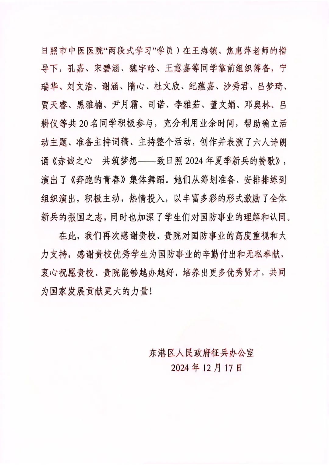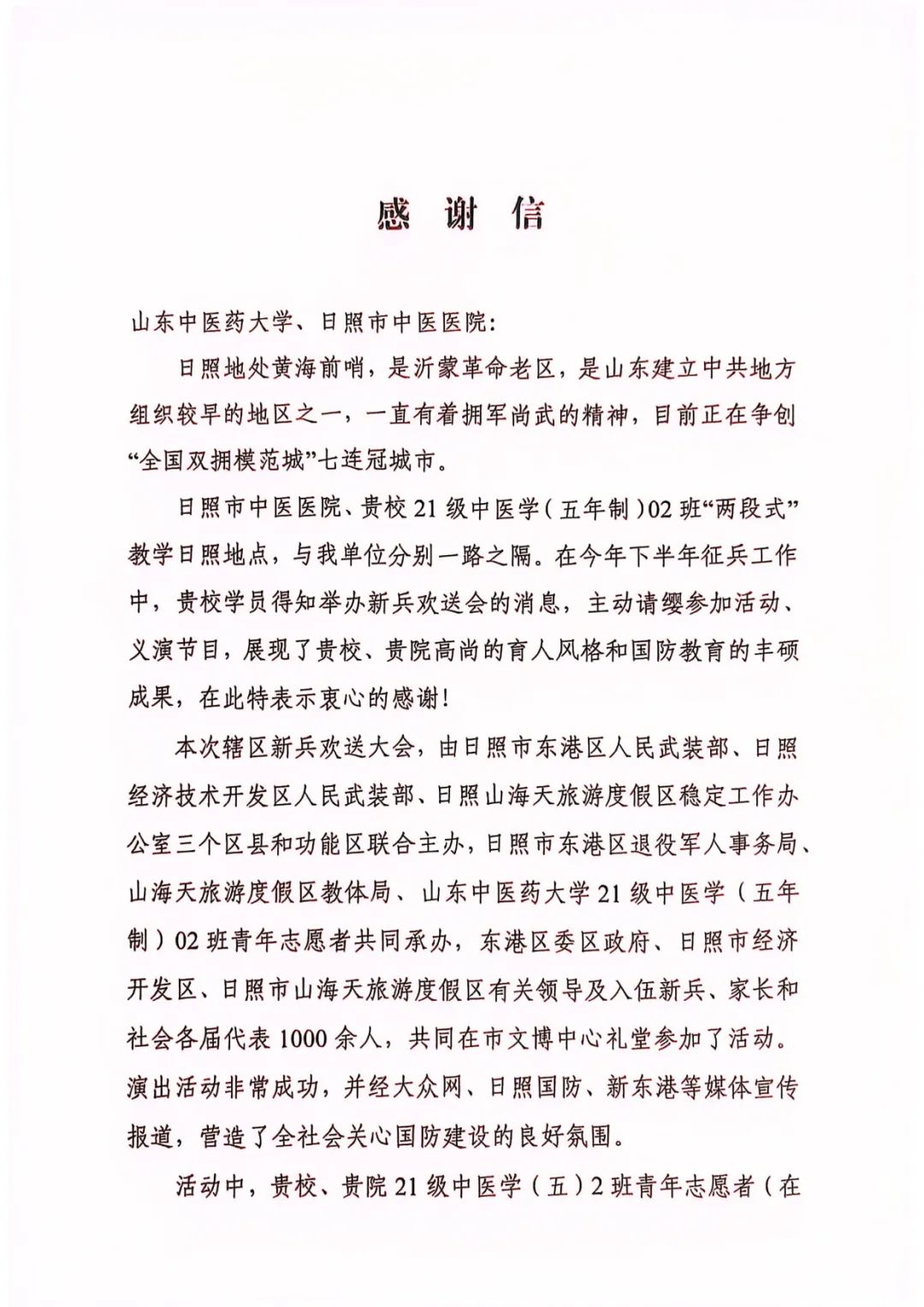日照市中医医院、贵校21级中医学(五年制)02班“两段式”教学日照地点,与我单位分别一路之隔。在今年下半年征兵工作中,贵校学员得知举办新兵欢送会的消息,主动请缨参加活动、义演节目,展现了贵校、贵院高尚的育人风格和国防教育的丰硕成果,在此特表示衷心的感谢!