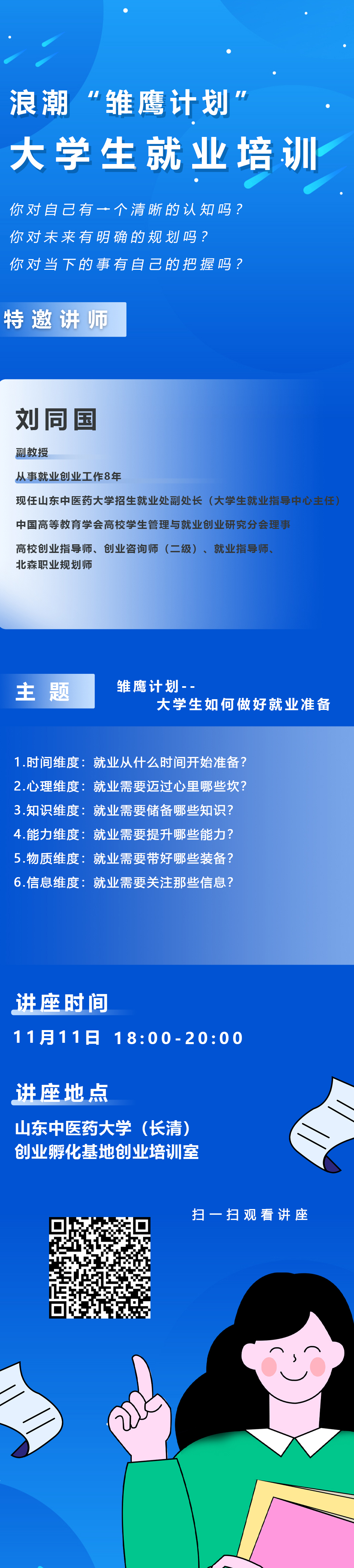 本次课程邀请学校大学生就业指导中心刘同国老师授课,从时间、心理、知识、能力、物质和信息等六个维度来指导大家做好就业准备,请大家扫描海报中的二维码观看。后续精彩培训,请大家继续关注“山中医智就业服务平台”或者“自拍流出 就业信息网——就业课堂”。