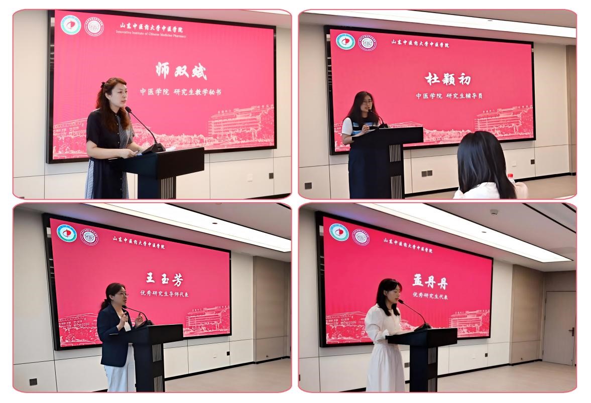 随后,研究生教学秘书师双斌对2025级研究生培养方案进行了系统解读。研究生辅导员杜颖初重点讲解了学院规章制度与日常管理纪律,引导新生自觉遵守学术道德与校园规范。优秀研究生导师代表王玉芳教授在发言中分享了指导研究生的经验与感悟,并结合自身教学科研经历鼓励新生主动交流,稳步探索。优秀研究生代表孟丹丹分享心得,建议新生合理规划时间,深化中医药理论理解,成为传承与创新兼备的中医药人才。