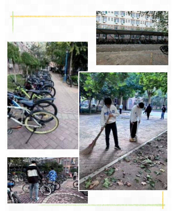 10月26日上午,学院“绿色行动小组”在学生宿舍区展开卫生环境治理活动。活动过程中,同学们分工明确,井然有序,认真地清理宿舍区应急通道及周边的生活垃圾和杂草落叶,摆正乱停乱放自行车,并清理长期占用公共资源、占用人行通道的无主车及坏旧自行车。通过治理,校园宿舍区域卫生状况得到了明显改善,宿舍区卫生情况干净整洁,环境面貌焕然一新。
