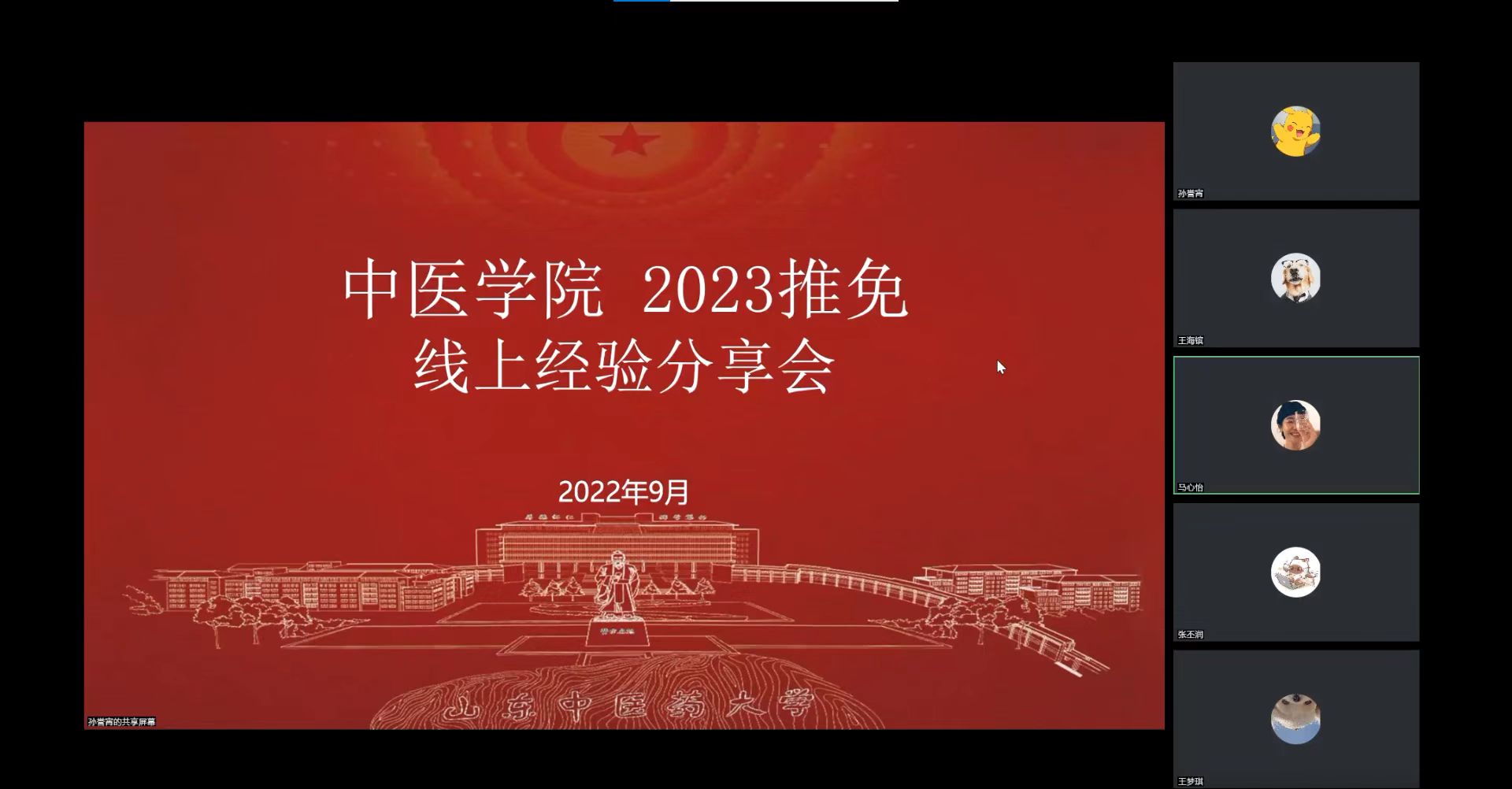 团总支举办2023推免线上经验分享会。邀请已分别推免至南京中医药大学的王欣哲同学、上海中医药大学的徐艺轩同学、北京中医药大学的李德龙同学、和中国中医科学院的马心怡同学进行经验分享、答疑解惑。会议由自拍流出