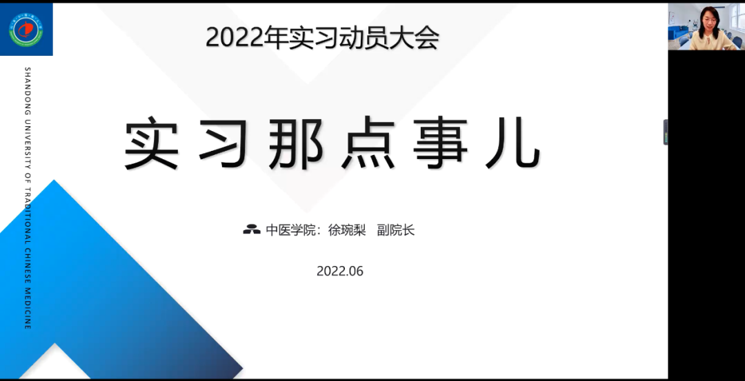 副院长徐琬梨老师耐心详细地讲解了“实习那点事儿”,强调了医学生实习的重要性,并具体讲解了中医学生临床实习目标、实习内容和实习考核等事项。她希望同学们坚持理论与实践相结合,更加深刻地理解“纸上得来终觉浅,绝知此事要躬行”,在实习过程中不断磨练自己,练就精湛医技、锤炼高尚医德,服务人民、奉献社会,充分展现新时代中医学子的风采。