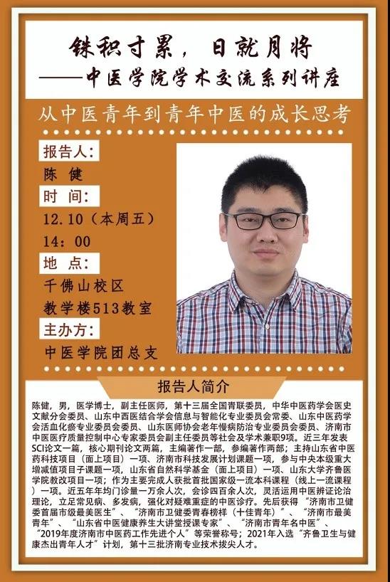 学术交流系列讲座在千佛山校区教学楼513顺利举办。山东大学附属济南市中心医院中医科副主任医师陈健老师开展题为“从中医青年到青年中医的成长思考——从经典到临床的思维切换与实践”的讲座,学院党总支副书记芦琳出席并主持讲座。