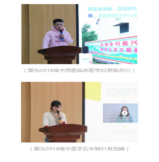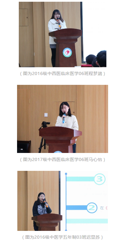 “校十大优秀学生”和“十大优秀干部”获得者,他们分别是2016级中西医临床医学06班程梦涵、2017级中西医临床医学06班马心怡、2016级中医学五年制03班迟显苏、2016级中西医临床医学02班陈存川、2018级中医学五年制01班刘婧。五位同学全面系统地分享了自己的学习成绩、成果及经验。