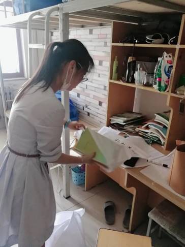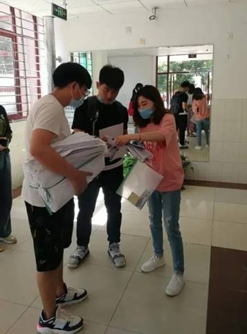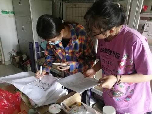 由学院辅导员带领各自的学生志愿者,两个人一组,一人负责视频连线同学,一人负责依据指示查找书本。同一宿舍的课本全部找齐后,依次进行打包、标记,对宿舍进行简单的整理后进入下一个宿舍。所有同学的书本都打包完成后,大家再一起运到指定地点,依据同学们前期云端下单的数据,打印粘贴快递单,进行精准邮寄。