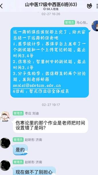 为保证同学们在家学习也能按时完成老师们布置的任务,团支部书记带领学习委员积极总结每周学习任务,保证每一位同学不落下功课。