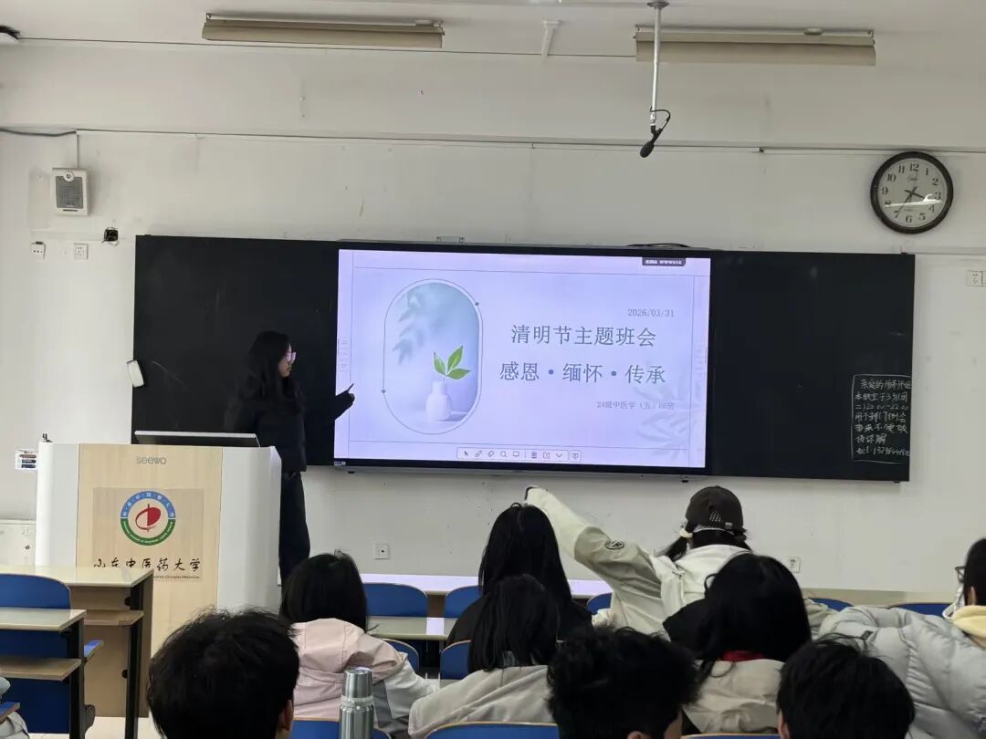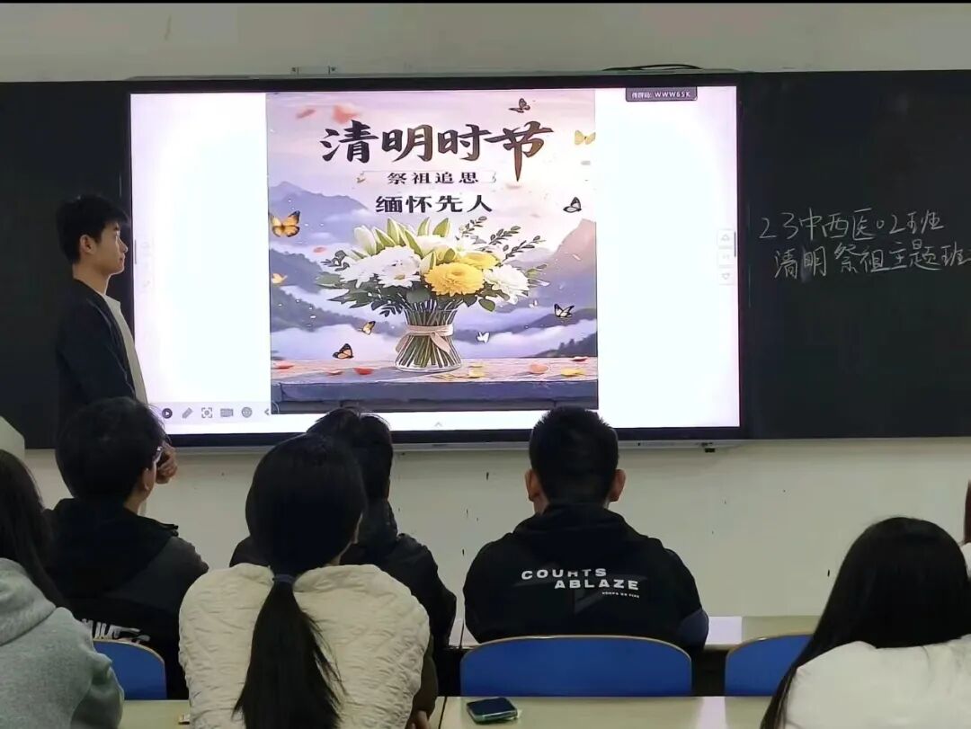 清明之际,学院组织各班学生开展主题班会,围绕活动核心主题,融合中医药文化特色,讲解我校“十老”生平事迹、清明与中医药的渊源、艾草等药材药用价值,让岐黄文化浸润缅怀时刻,引导学子在学习中坚定医者初心。
