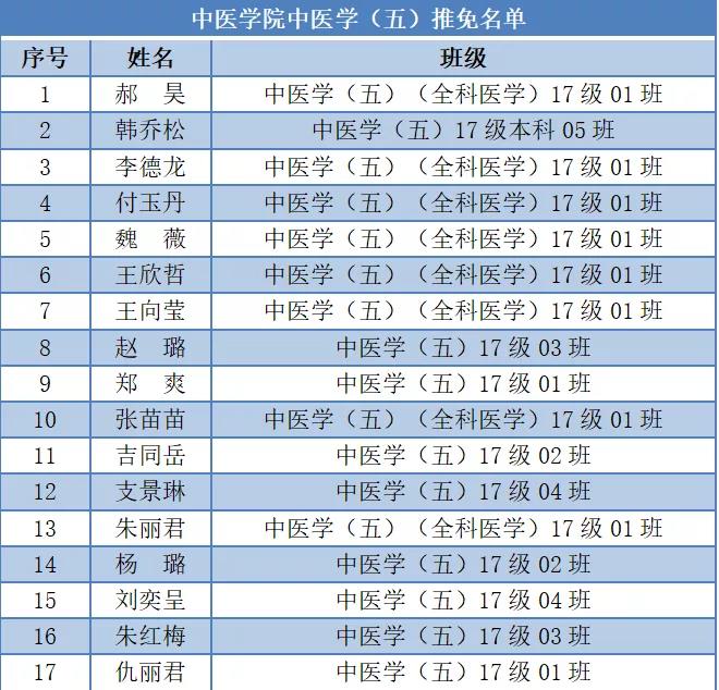 中医学(五)专业共17名学生获推免资格。