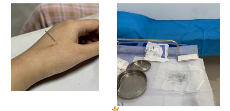 穴位埋线则更具挑战性,需要将可吸收线埋入穴位,持续刺激。第一次帮助医生在针中放线,做一些基础工作时,我手忙脚乱,担心操作不佳。但随着练习增多,我逐渐掌握了技巧,能沉稳地完成操作。