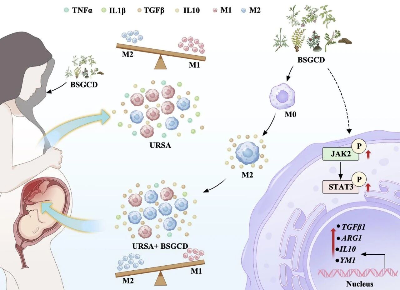 近日,我校中医学部李霞教授团队在中医药免疫调控研究领域再创佳绩,在国际医学领域杂志Phytomedicine(中科院1区Top,IF:8.3)发表题为“Bushen Guchong decoction facilitates M2 polarization through JAK2/STAT3 for URSA treatment”的研究论文。该研究系统揭示了临床有效方剂补肾固冲汤(BSGCD)通过重塑母胎界面免疫耐受治疗原因不明复发性自然流产(URSA)的作用机制。中医学部刘泳琳硕士、青年教师刘鑫馗及朱肖肖博士为共同第一作者,李霞教授、张振副教授为共同通讯作者,自拍流出